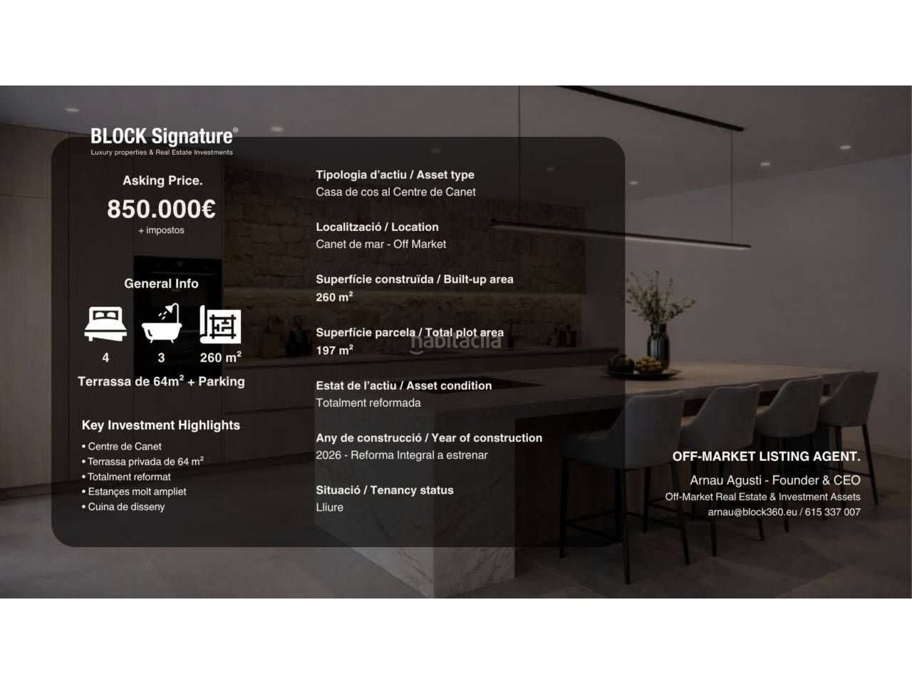 Propiedad de 260 m² construidos, actualmente en fase final de reforma integral con acabados de diseño y materiales de gran calidad. En aproximadamente 1 mes se publicará oficialmente en el mercado… pero hoy tienes la oportunidad de posicionarte antes que el resto.