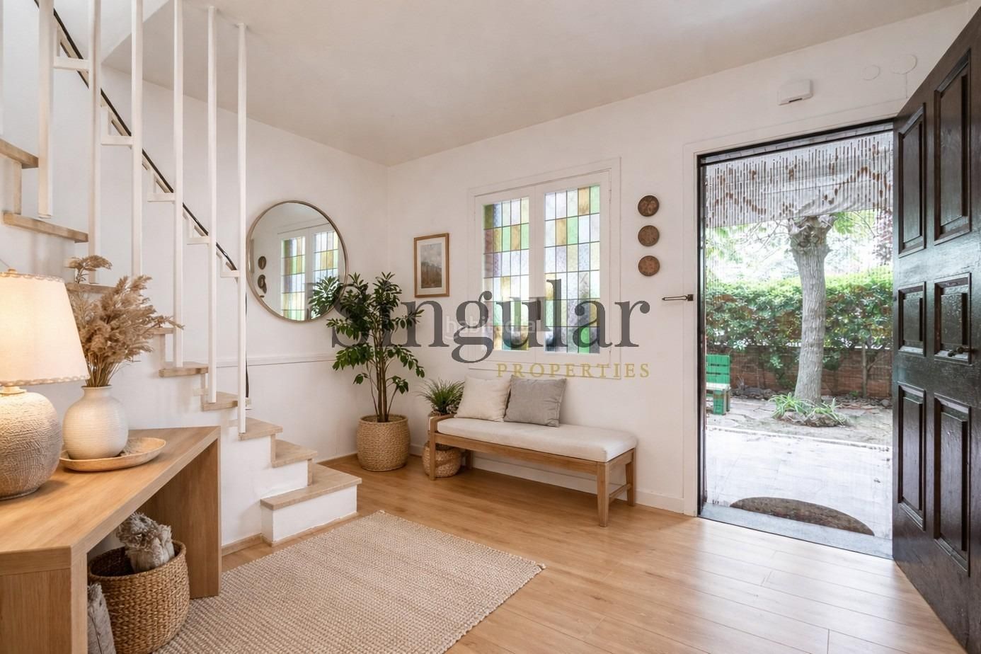 La vivienda se distribuye en dos cómodas plantas. En la planta principal, un amplio recibidor da la bienvenida y conecta con un luminoso salón-comedor presidido por grandes ventanales con vistas al jardín que envuelve toda la casa. La cocina, funcional y acogedora, dispone de una práctica despensa, junto a la misma hay una puerta que nos da acceso directo a la parte posterior del jardín, donde se encuentra una zona de barbacoa ideal para reuniones al aire libre. Esta planta también alberga dos habitaciones exteriores (una doble y una individual) y un baño completo.