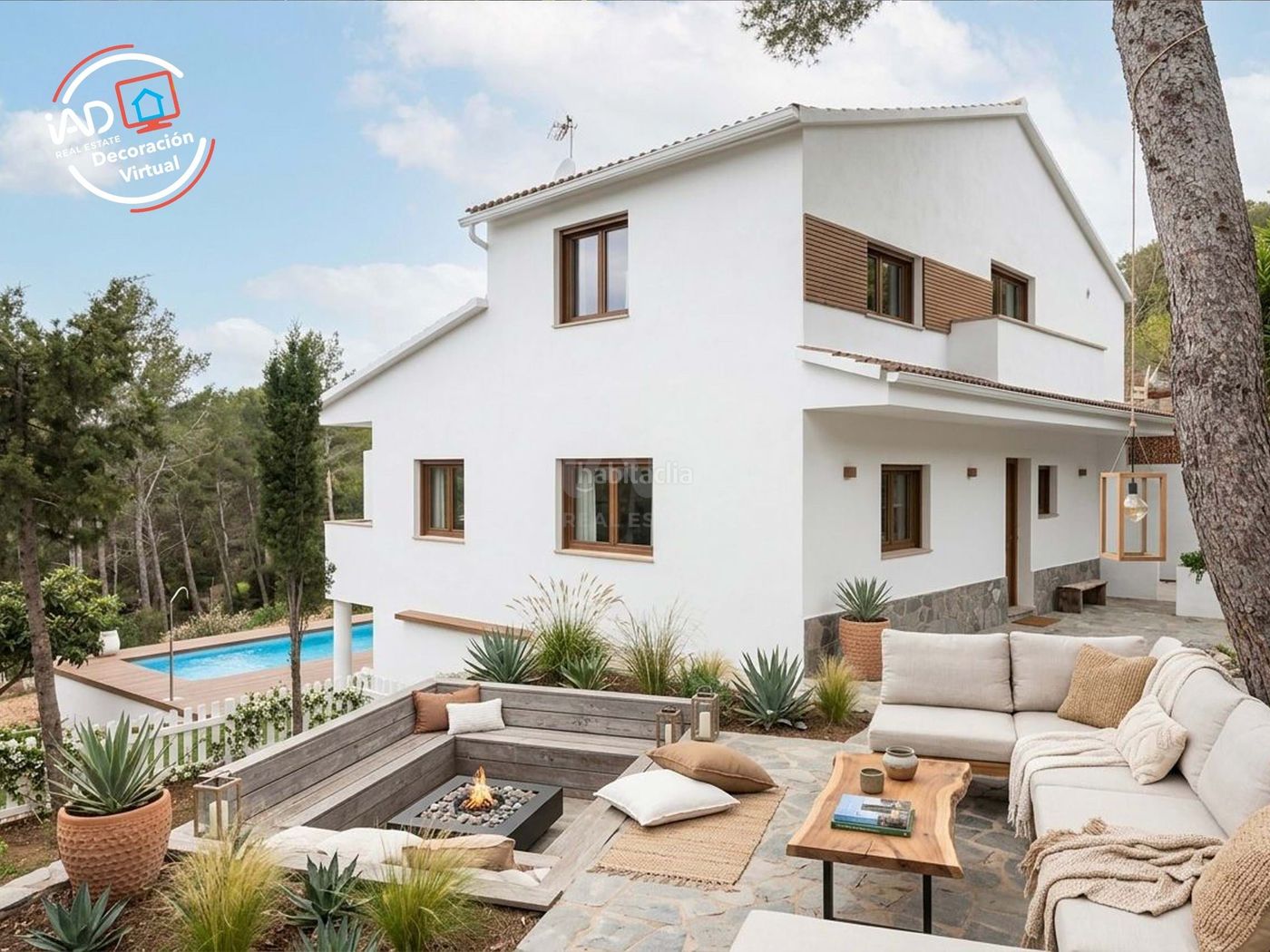 El exterior es, sin duda, uno de los grandes protagonistas de la propiedad. La parcela, amplia y cuidada, se divide en diferentes ambientes pensados para disfrutar todo el año: piscina privada con zona de solárium, área de barbacoa, acogedor espacio chill-out, zonas ajardinadas y rincones con árboles frutales que aportan encanto y frescura.