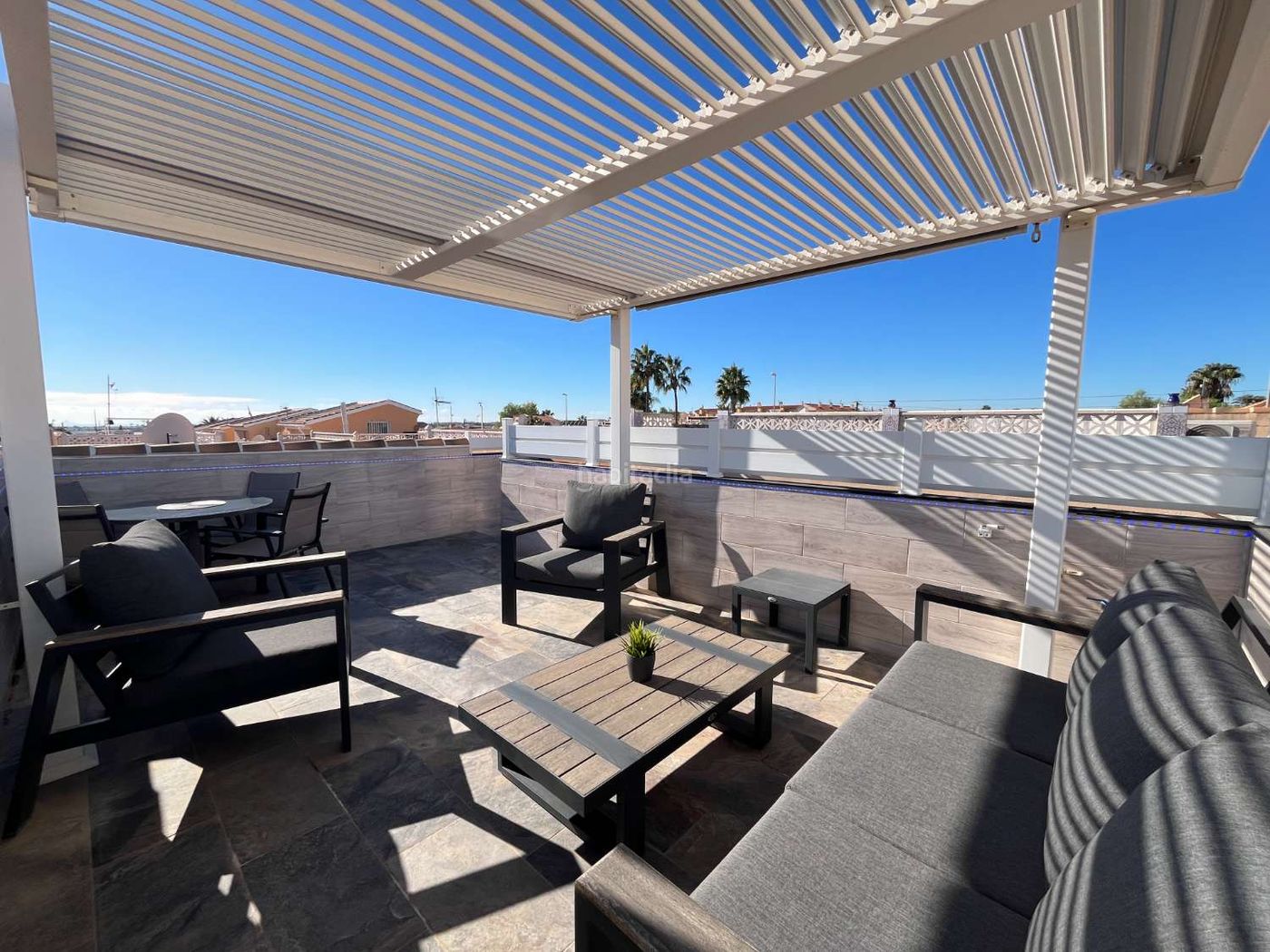 Uno de los principales atractivos de la vivienda es su solárium privado con vistas al mar y a los alrededores, equipado con zona chill out e iluminación LED integrada en paredes y escalera, ideal para disfrutar tanto de día como de noche.