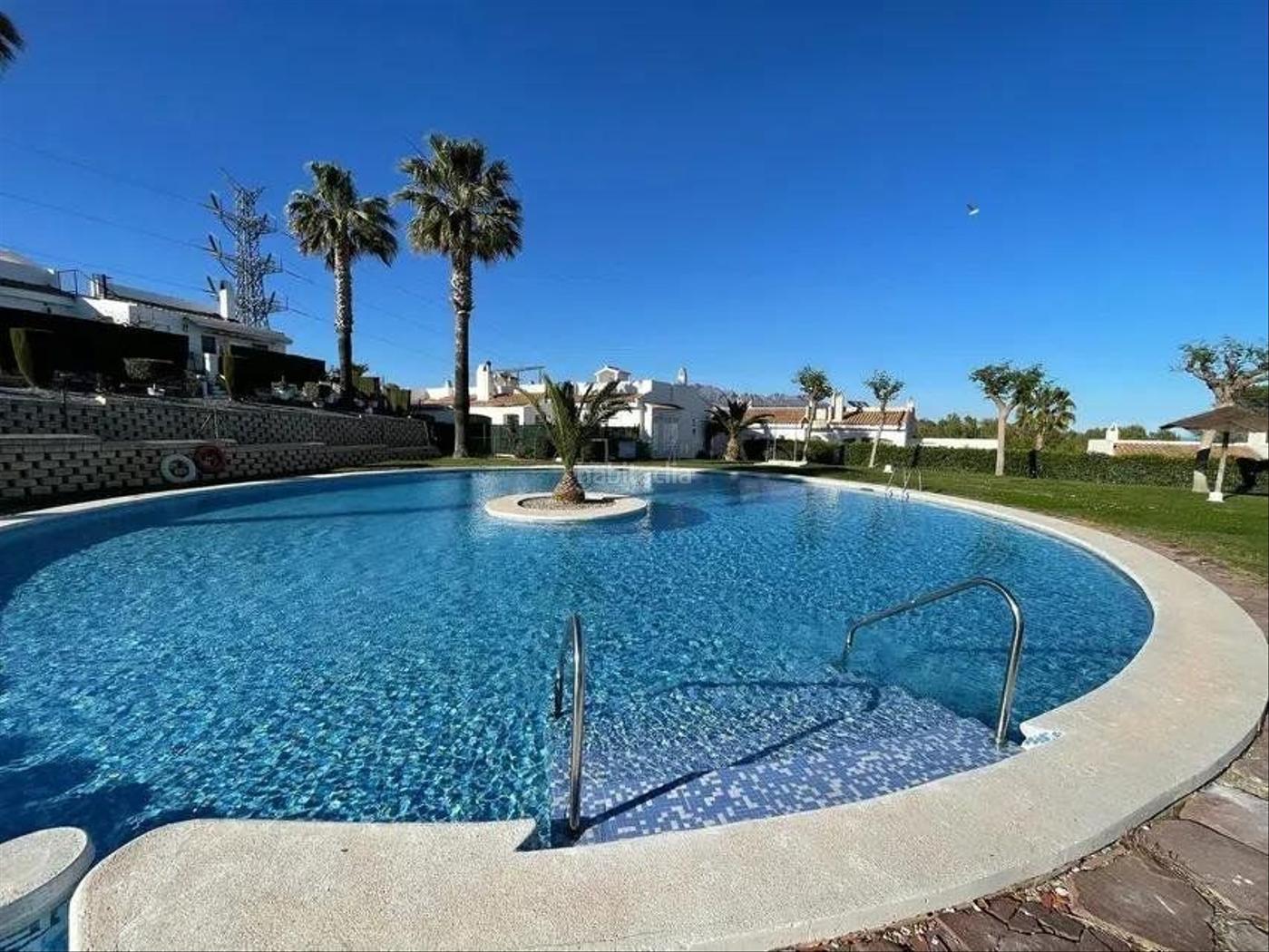 Piscina comunitaria rodeada de césped natural y palmeras, zona ajardinada, zona de los niños [IW]