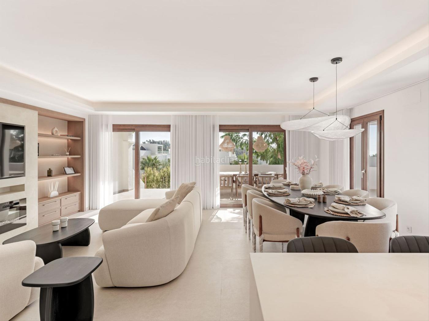 Desde aquí se accede a la terraza envolvente, que ofrece un espacio exterior cubierto y abierto, perfecto para comer al aire libre, bañarse o relajarse.
