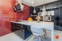 La cocina es grande y luminosa, con una isla central equipada con vitrocerámica, lavaplatos, horno empotrado, cafetera integrada, microondas y refrigerador. También hay una despensa.