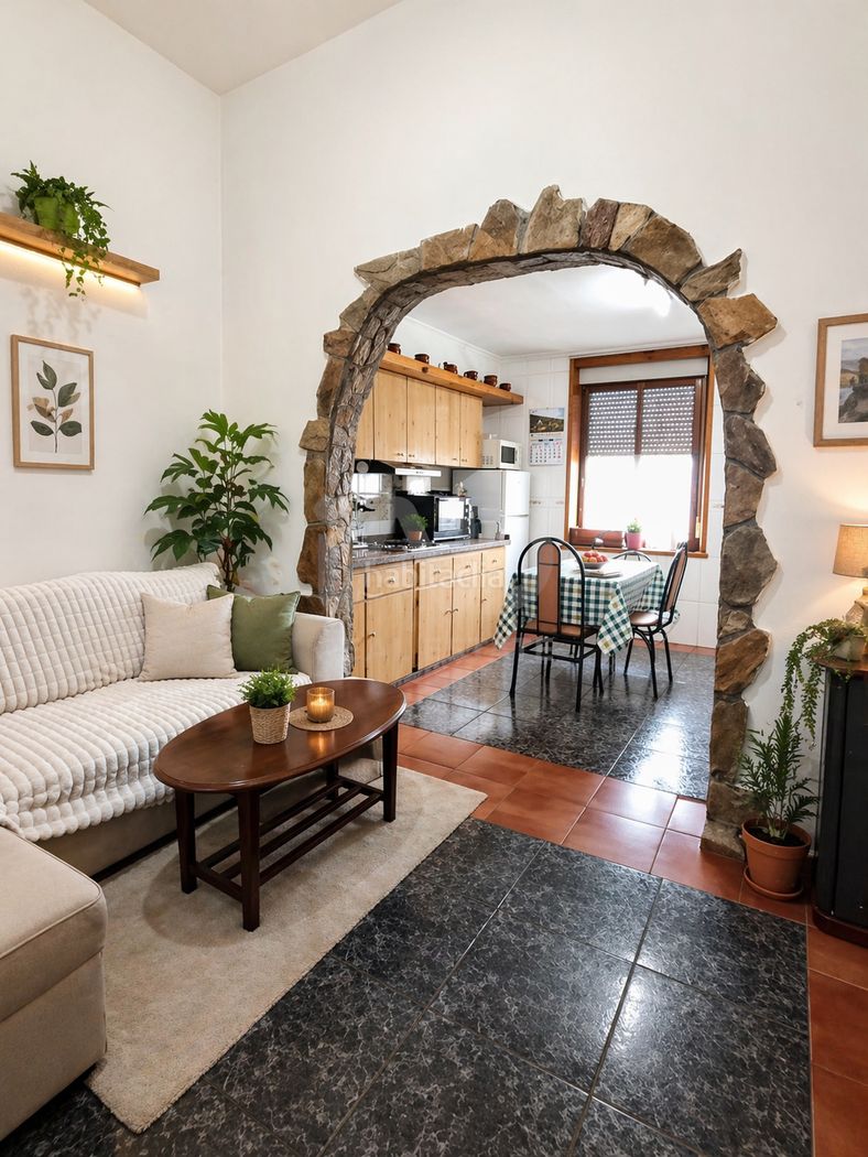 La vivienda conserva elementos con carácter, como el arco de piedra que aporta personalidad y calidez a la estancia, combinando el estilo tradicional con opciones de actualización según las necesidades del comprador.