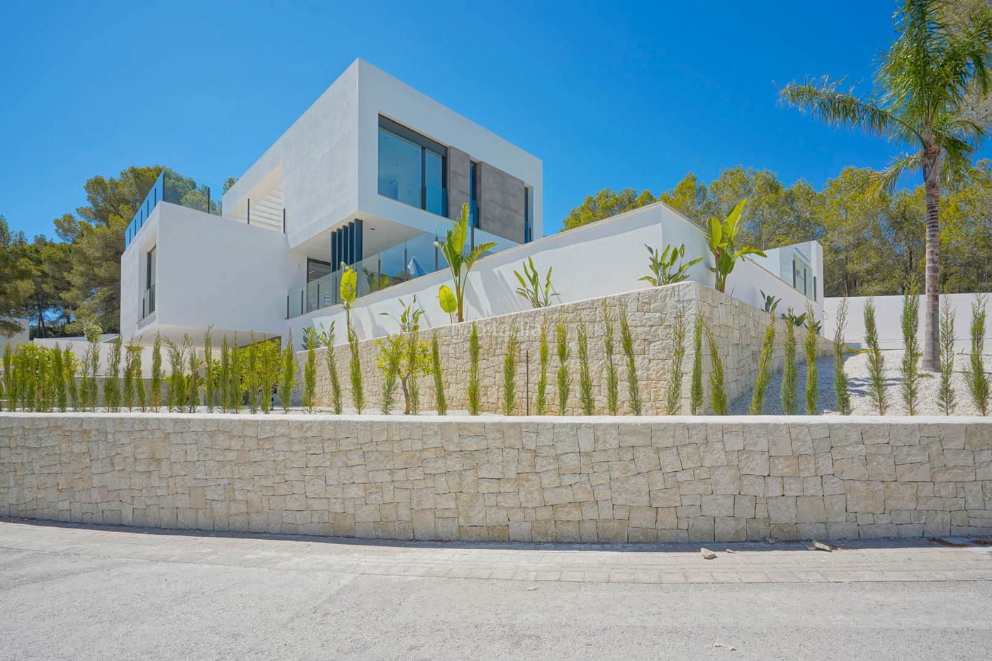 Esta hermosa villa está situada en una zona tranquila a menos de 10 minutos de la playa y del centro de Moraira. La villa está rodeada por una zona boscosa y se distribuye en tres plantas. La primera planta consta de un amplio salón-comedor, una cocina americana, un dormitorio doble con baño en suite y un aseo. A través de ventanas correderas se accede a una gran terraza parcialmente cubierta junto a la piscina. En la segunda planta se encuentra la suite principal con un gran vestidor y baño en suite y dos dormitorios dobles que comparten un baño. Todos los dormitorios de esta planta tienen acceso a una gran terraza con pérgola. La planta baja consta de un garaje con espacio para dos coches, el camino de entrada en frente del garaje tiene espacio para aparcar dos coches más. Además, en la planta baja hay un lavadero muy grande, una sala de secado, un gimnasio, un trastero, una sala técnica y un baño exterior. La villa está rodeada de un jardín mediterráneo de bajo mantenimiento y tiene riego automático. La villa también dispone de aire acondicionado y calefacción por suelo radiante. La villa está lista para entrar y se vende con los muebles incluidos en el precio.