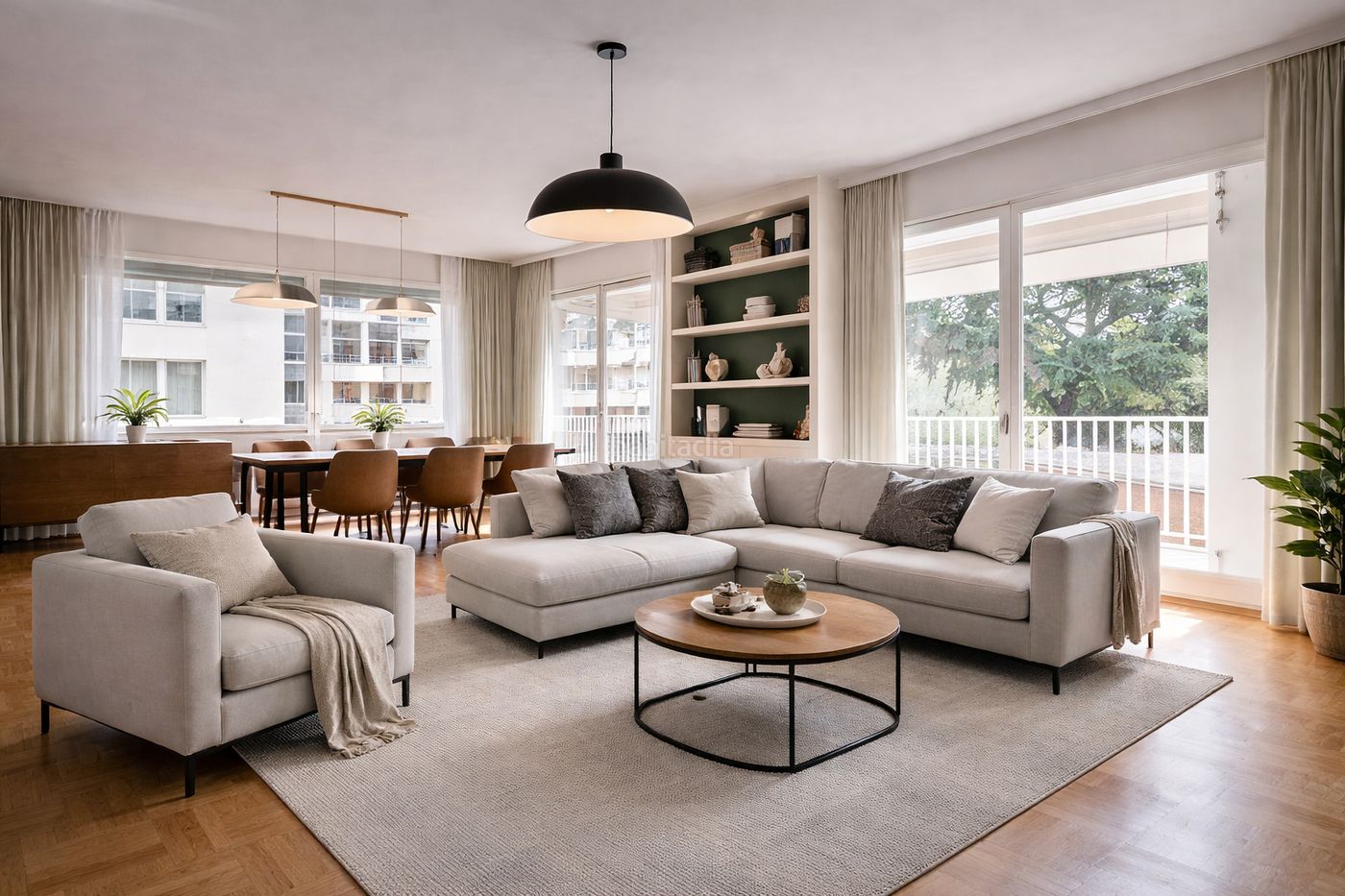En la calle Cerignola, en una vía sin salida muy tranquila y con circulación limitada únicamente al acceso del parking de la finca, esta vivienda ofrece un nivel de calma y privacidad difícil de encontrar en la zona. Con 185 m² construidos, el piso es esquinero y cuenta con una excelente orientación: Este y Sur en la fachada principal, abierta al parque, y Oeste en la posterior, lo que asegura luz natural durante todo el día. Desde el salón-comedor se accede a una terraza de 14 m² con vistas despejadas al parque. La vivienda conserva el espíritu de los pisos amplios y bien distribuidos, con una clara separación entre la zona de día y la de noche. Casi todas las estancias son exteriores; solo dos baños ventilan a patio de luces. Además, únicamente dos paredes colindan con el piso vecino, lo que garantiza un alto nivel de silencio. La distribución actual es cómoda y funcional: salón-comedor de más de 30 m² con salida a la terraza, un amplio recibidor que articula las zonas de la vivienda y una cocina independiente con office, además de un lavadero separado. Dispone de cinco habitaciones: tres dormitorios dobles, uno individual y una habitación de servicio con baño propio, además de dos baños completos de buen tamaño, uno con ducha y otro con bañera. Todas las estancias son amplias, bien proporcionadas y luminosas. El piso permite una redistribución sencilla, por ejemplo para crear una suite principal con vestidor y baño. La finca ofrece servicios propios de una vivienda de alto nivel: conserje, solo dos vecinos por planta, doble ascensor, videoportero y cámaras de seguridad.