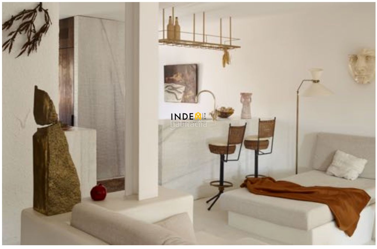 Appartement situé dans le quartier balnéaire de Cubelles, rénové en 2018 par un studio de design barcelonais. Baigné de lumière méditerranéenne, il arbore une palette de blancs, d'or et de bruns foncés qui confère élégance et sérénité à chaque pièce.