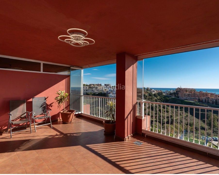 La propiedad se distribuye en dos plantas, proporcionando tanto privacidad como agradables zonas sociales. En la planta de entrada encontramos un luminoso y espacioso salón, una cocina moderna totalmente equipada, zona de almacenamiento y un aseo de cortesía. Tanto desde la cocina como desde el salón se accede a una impresionante terraza de aproximadamente 24 m², con espacio suficiente para reuniones familiares alrededor de la mesa. La terraza está equipada con cortinas de cristal que pueden abrirse o cerrarse completamente, permitiendo su uso durante todo el año. Desde aquí se disfrutan vistas panorámicas desde el sureste hasta el suroeste, con el mar Mediterráneo y el puerto de Fuengirola en el horizonte.