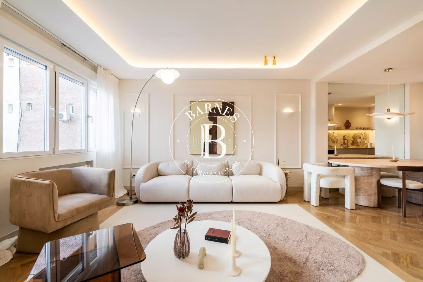 La propiedad se caracteriza por sus techos altos y un amplio salón principal con varios ventanales que aportan una agradable sensación de amplitud y luminosidad. En este espacio destacan los suelos de madera natural, las alfombras y cortinas seleccionadas a medida, así como un sofisticado diseño de iluminación indirecta que refuerza la atmósfera acogedora del conjunto. La cuidada paleta de colores pastel, junto con materiales de última tendencia, aporta equilibrio y personalidad a la vivienda. Las puertas arqueadas, las líneas curvas y los detalles arquitectónicos generan continuidad visual y un carácter distintivo.