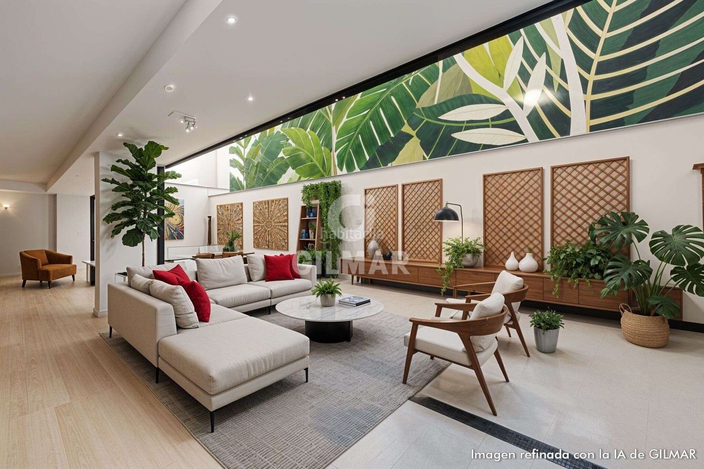 El salón es amplio y cuenta con una chimenea central que le da un toque cálido increíble, creando un espacio acogedor y perfecto para disfrutar de momentos de relax. La cocina está totalmente equipada y amueblada con electrodomésticos de alta gama, lo que la convierte en un lugar ideal para los amantes de la gastronomía.