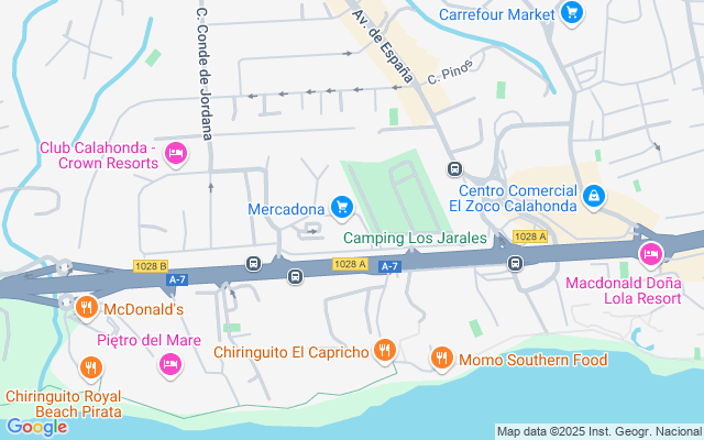 Mijas Costa is the stretch of coastline that lies in between the boundaries of Fuengirola and Marbella. Most of this stretch of land has been urbanised and includes the resorts of El Faro, El Chaperral, La Cala de Mijas, Riviera del Sol, Calahonda and Sitio de Calahonda. Sitio de Calahonda is the largest urbanisation on this part of the costa and Calahonda beach is the largest beach in the Mijas municipality covering 4.5km of coastline. The coastal bus service links all of these resorts and within Mijas Costa there are 12 golf courses. On its border with Fuengirola lies the Miramar shopping centre and the water park
