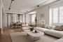 El salón-comedor y la sala de estar, con una superficie total de 65 m², conforman un espacio amplio, luminoso y acogedor. Tres grandes ventanales a la calle Galileo inundan la estancia de luz natural y conectan con una terraza orientada al Parque Santander, ofreciendo vistas despejadas y una sensación de amplitud excepcional. El comedor o despacho, de 45 m², se comunica con la sala de estar, mediante un elegante cerramiento de vidrio y cerrajería artesanal. Este rincón, equipado con estanterías de madera natural a medida y una chimenea, aporta carácter y calidez al conjunto.
