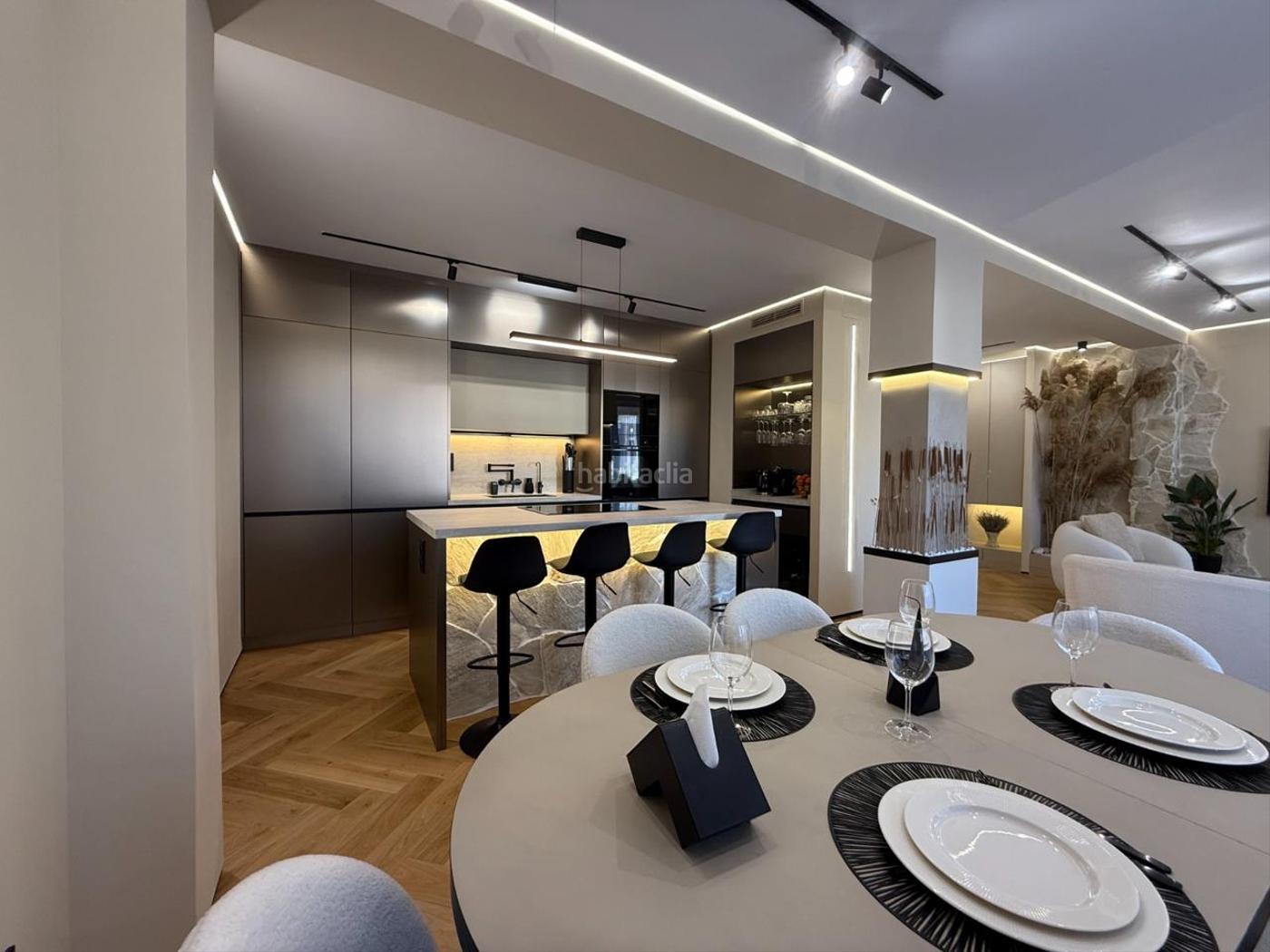 La cocina, de estilo contemporáneo, está equipada con electrodomésticos de última generación, encimeras de piedra natural y una isla central que se convierte en el punto neurálgico de la estancia. La fusión con el salón crea un ambiente perfecto tanto para la vida diaria como para el entretenimiento de invitados.