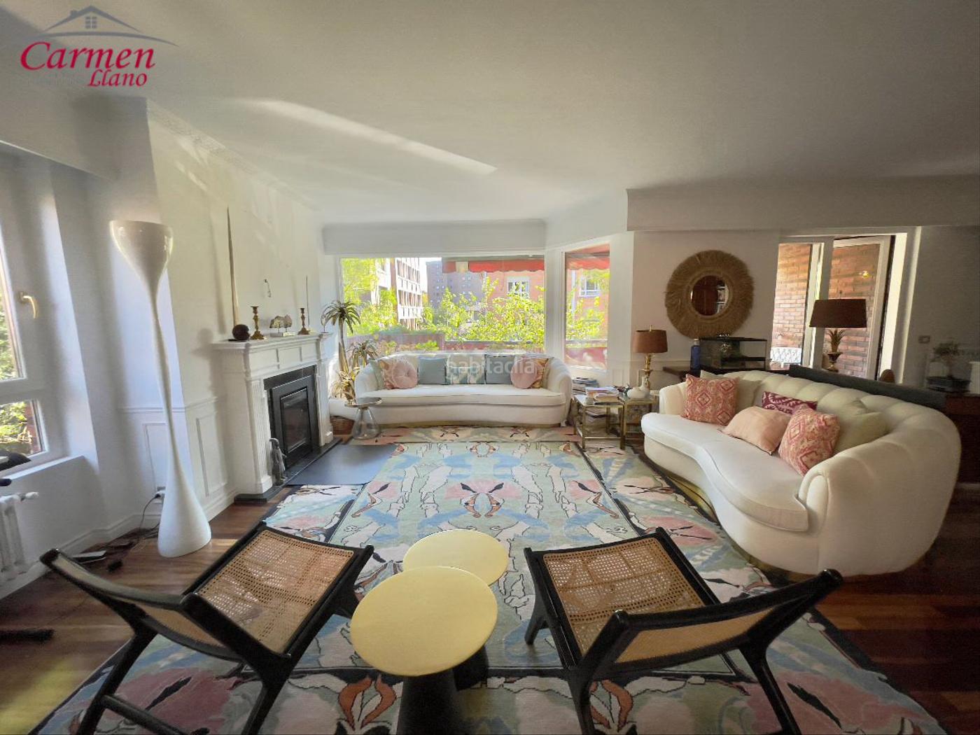 Gran salón con chimenea y con acceso a una coqueta terraza.