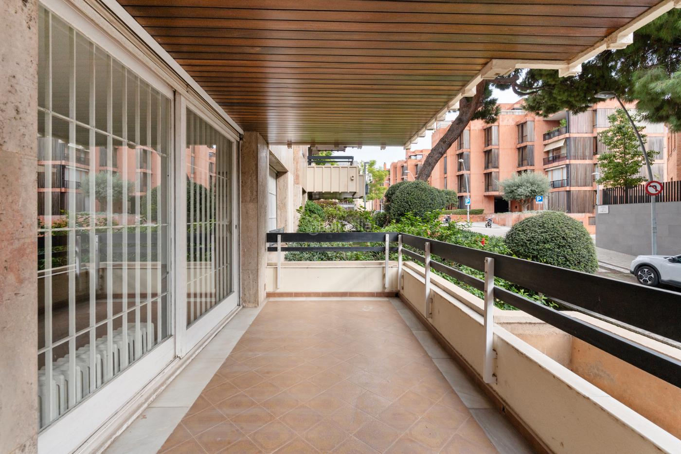 Piso en venta en la zona alta de Barcelona. Finca con servicio de Conserje, Jardín exterior rodeando la finca.