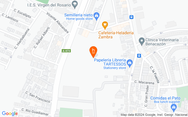 Esta situada en la Avenida de Sanlúcar la Mayor, nº 26, con inmejorable acceso, ya que se encuentra a menos de 500 m de la Autovía A-49 Sevilla-Huelva y del Hotel Abades Benacazón, poseyendo una fachada principal a la citada avenida de mas de cien metros, siendo esta la arteria principal de acceso al municipio desde la autovía.