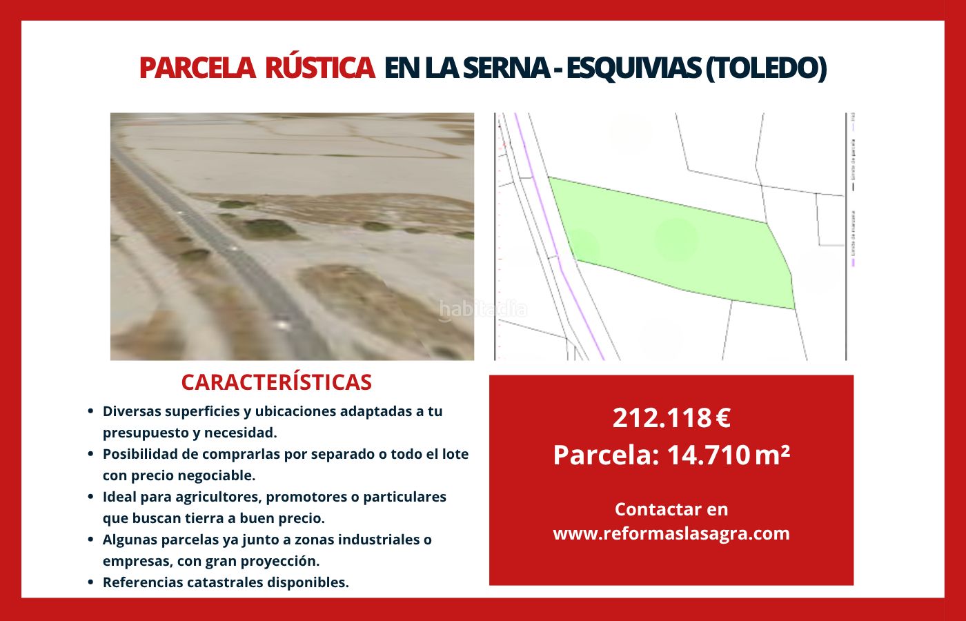 Inmobiliaria & Reformas La Sagra te presenta en EXCLUSIVA PARCELA RÚSTICA en ESQUIVIAS (Carretera de Borox, Toledo), ideal para inversión agrícola, actividades recreativas o incluso como aportación para futuros desarrollos.