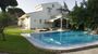 El exterior de la vivienda es uno de sus grandes atractivos: una amplia zona ajardinada acompaña a una espectacular piscina desbordante de cloración salina, de forma irregular, con 14 metros de longitud y 76,2 m², equipada con cascada, chorro a presión, ducha exterior de agua fría-caliente y zona solárium. Junto a ella se ubica un completo espacio auxiliar de 66 m² que incluye baño-vestidor con ducha, cuarto de maquinaria y trastero, además de un amplio gimnasio con suelo de madera. La propiedad dispone también de aparcamiento techado para tres vehículos (46 m²).