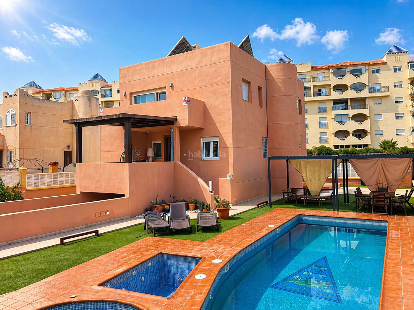 Situado junto al Paraje de Punta Entinas y a sólo unos minutos a pie del centro de Almerimar. Cuenta con una parcela de 500m2 y un interior con 4 habitaciones y tres baños. Reformado con respecto a la construcción original para incluir cambios en toda la distribución y añadir piscina, con resultado de una vivienda moderna y funcional. Terraza, sol todo el año y zona tranquila: ideal para un proyecto de familia. La vivienda es propiedad de un particular, por lo que el comprador deberá negociar su propia financiación, normalmente disponiendo del 20% del precio más los gastos. Al precio hay que sumarle el Impuesto de Transmisiones (7%), la Notaría y el Registro.