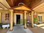 En la parte exterior tiene una pergola muy grande, un garaje para tres coches cerrado,una fuente de piedra, una barbacoa con cocina colindante,bancos y aseo exterior. Al lado está la piscina completamente vallada.