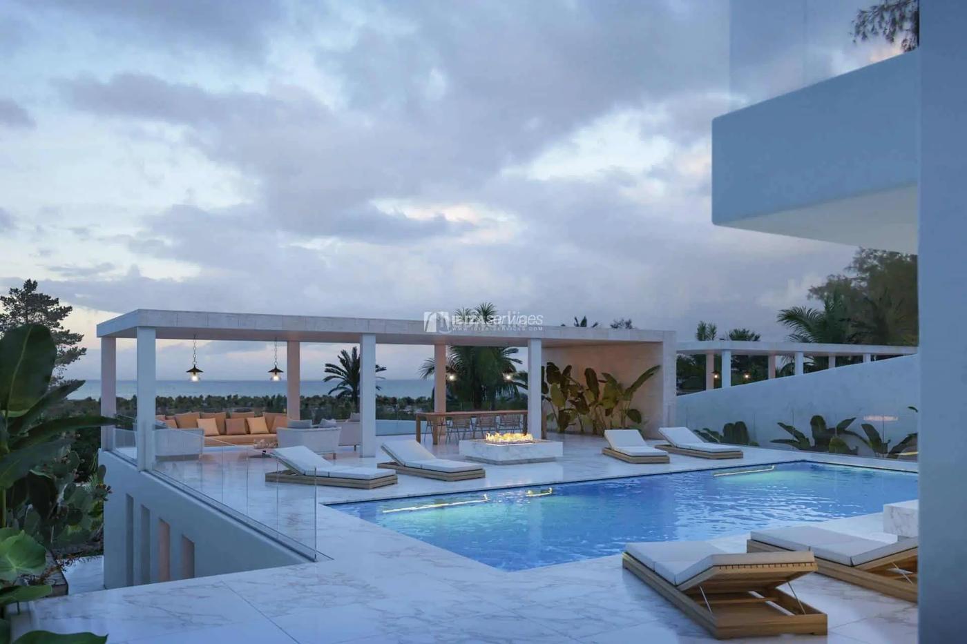 Toma el sol o sumérgete en tu piscina privada, situada entre amplias terrazas, perfectas para empaparte del ambiente de Ibiza.