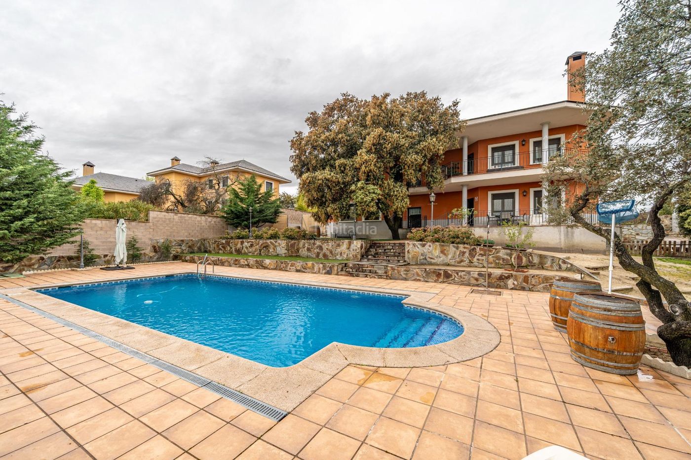 El exterior es uno de los grandes atractivos de esta propiedad: una extensa parcela con un cuidado jardín y una espectacular piscina, ideal para disfrutar del aire libre en un entorno privado y exclusivo.