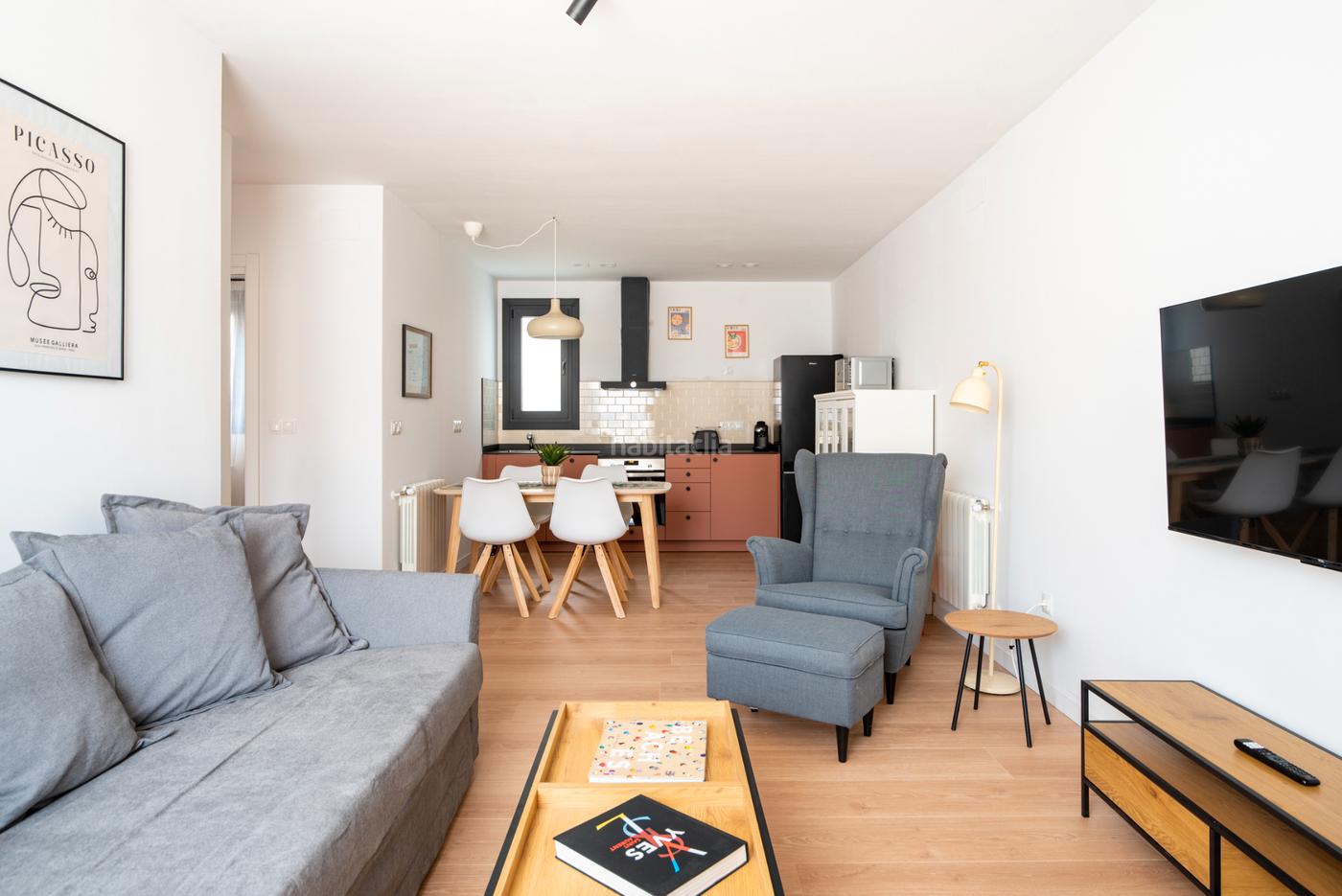 Amplio apartamento con cocina americana abierta al salón, salón con sofá tres plazas y butaca, tv e internet incluidos en el precio. Cocina totalmente equipada, nevera combi, horno y placa de inducción, lavadora y lavavajillas, menaje.