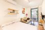 Este estudio destaca por su ambiente acogedor y práctico. La zona de día ofrece un cómodo espacio con sofá, tele y salida a un balcón con vistas a la calle, ideal para disfrutar del aire fresco y del ritmo de la ciudad. En el mismo ambiente se encuentra la cama doble, acompañada de armarios que facilitan el almacenamiento y mantienen el espacio bien organizado.