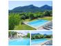Piscina privada rodeada de tumbonas y con vistas a la montaña.